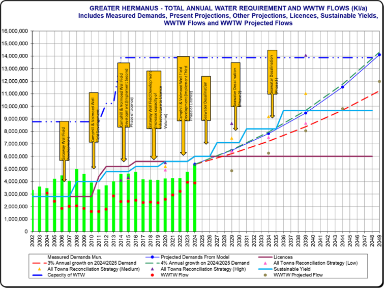 The aquifer contains an estimated 4,500 million cubic metres of water. Even if pumped more heavily, current use would remove only a fraction of this, while annual rainfall rechargeexceeds abstraction. Careful monitoring also prevents seawater intrusion, a common risk in coastal aquifers. Despite this safety net, the Department of Water and Sanitation caps Hermanus’s combined surface and groundwater use at 6 million cubic metres a year. Right now, that is just enough to meet demand. But the OM predicts that the town will continue growing by about 4% per year, which means usage will hit the limit by 2030 and could rise to 14 million cubic metres by 2050.