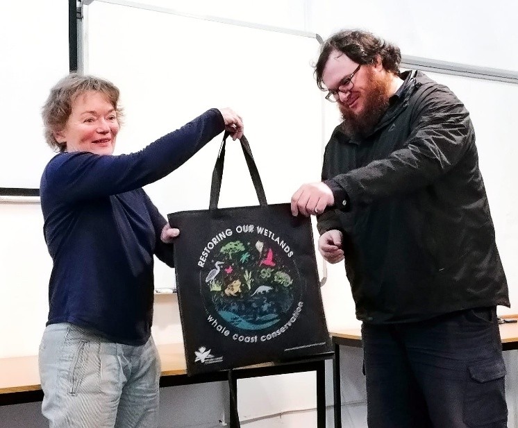 After the talk, WCC Chair Dr Pat Miller thanked Dylan Blake and presented him with a gift contained in a bag promoting wetland restoration.