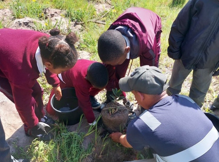 Planting milkwoods with Gr 2 learners from Hawston Primary